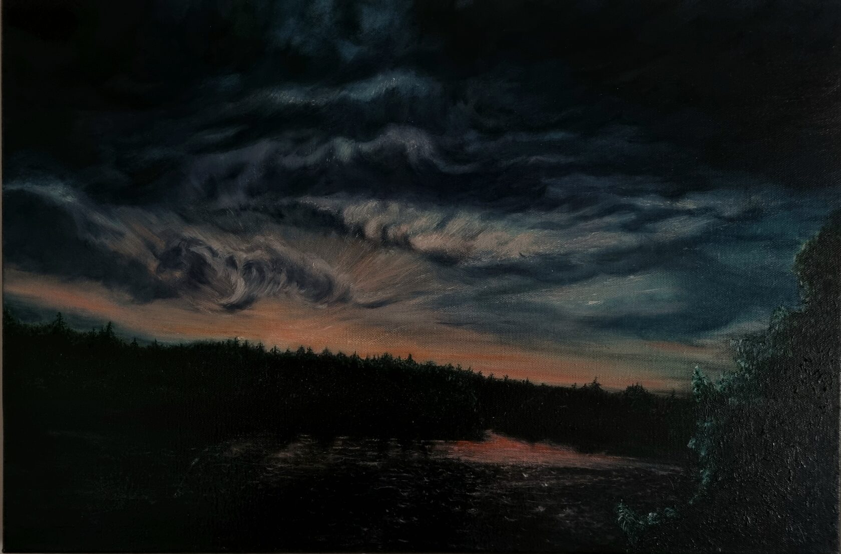 Переносимся в мир видимый и невидимый, где природа и мистицизм сливаются воедино. Ночной лес кишит тайнами и загадками, озарённый последним отблеском заката. А облачная масса, нависшая над горизонтом, вот-вот превратятся в мифологических существ, готовых опуститься на землю.